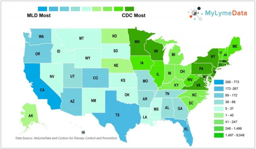 Did you know that Lyme disease is not considered by the CDC to be endemic in some western and southern states? This has led to a systematic under-reporting of Lyme disease in these areas according to MyLymeData.org. On the map above, the states in blue have a higher number of people enrolled in MyLymeData than are included in total CDC Lyme disease case reports. (In green states, the CDC has more cases.) The important thing to recognize is that Lyme disease is widespread and we must all be vigilant to protect ourselves and our family from this disease.